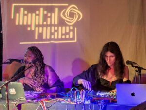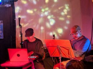 And finally we have Digital Roses, vocals and laptops, keyboards and effects. Theres a little bit of a sneaky start: a short song, just brief ramps of wispy bass and an introduction to the voice. The second starts with string synths and a bell before dropping away to just a couple of lines of that delicious singing and we’re into “Under the sea”, one side of their excellent single. The bass drones slide in, breathe, and expand, the voice is looped, a bassline circling with higher lyrical lines over it. A ballad at the Spirit of Gravity? It winds out with fat basses and the refrain “that’s where you’ll find me”. The second track drops the bass even further, the subs getting to work. A chanted backing line from somewhere, the voice back straight in. a slow off beat hi-hat introduces rhythm, then clatters out while the bass whirls up and something starts grinding and it ends surprising us. Arpeggios introduce the next song, bass swoops and winds around that, machine whirrs slide around that, building a slurring twist, the arpeggio drops to bring a bass pulse in. Then kick drum heartbeats, buzzing bass where the hi-hats used to be. With that buzz comes the voice again, like being in a queue outside an old rave, while the person next to you is the surprising singer. At this stage I think the vocal effects have started playing so there is some improvising going on with those, but we don’t notice. Toy piano chopsticks temp notes start the next one with a two note breath organ line that hits the resonant frequency of the room, that fades and the voice brings it back like a harmonium, think Nico but a voice as expressive as hers was neutral, still stark but clear and bright. They keep it simple for this one, mesmerising, a slow evolution of the harmonium drones, towards the end there’s a little bit of processing on the voice. The penultimate track starts with big piano and string synths that give way to a bass synth and mid-tempo drums, it builds drops for the chorus, veers off for as creepy interlude and back to the beat. Hard rave buzzes disturb the background and we get some monster bass feedback through one of the delays. And then to finish an epic dub version of “Waterfall” the flip of the single. It starts with organ, whispered vocals, bass and flurry of sparkling arpeggios before dropping to bass and voice. Lo-fi beats murk in, and it builds sizzling buzzes, the swirl of synth and another drop to noises and voice before building slowly again. Every run through adding disturbing layers, the ecstatic swirl of the synths tumble down into loops of scattered vocals and a monster sub bass drone that incrementally forms itself into something like the bassline, the voice comes back in full, the bass just pulsing away, off noises scurry about the walls and it ends.