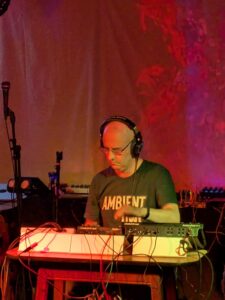 Beginning the evening we had Simon Heartfield, starting with a booming super slow two chord bass riff, behind it build 3 separate arpeggios slowly way down in the mix some drums drift into play, and possibly some more arpeggios all tick-tocking away, weaving round each other, then there’s a puff of air and they mostly evaporate leaving just a couple, and the bass riff and drums and then the nick comes in dancehall style. This feels like a new song, with a syncopating synth riff, glassy cowbell and one of those lines that could be a voice or a synth leading the melody. There’s a short section where the beats go 4×4, but then it’s back to skipping along. Then everything falls away to a squelching and a new beat builds around that, ticking hi hats, white noise snare, the synth starts to ping very occasionally a kick booms. We get some more interweaving synth lines with emergent melodic appeal, and the drums syncopate up again, and we get some weirdly detuned synths, that break everything down and then when it comes back in weirdly fit. As it shifts into the next track the beat takes on that distorted 606 sound on the bass drum that’s all tone, it hits a groove for a while – there’s an offbeat, some work on the beat, rattling the cymbals and a delayed pinging piano line precedes a slow unfolding line that could be from Autobahn. An actual vocal sample, and ooh, that back to the fours on the kick, and some big buzz on a bass every once in a while. Steel pans bounce around the field of sound, followed by that pinging piano again. A filtered voice redolent of that long ago set by Mr Hopkinson’s Computer sings against the human sample, and it breaks down to just those two, before the next piece starts, a pretty broken beat, a stab here, hi-hat there, one note pings in, a horn. Building. A rattlingly fast hi-hat brings it all together and the beat rises to completion. And as it does, we get a breakdown… a little riff on sounds like a CZ organ is part of the puzzle. Another bouncing psychedelic passage with various short notes scattering about from different sounds sources, then a worrying, persistent one note bass line comes in banging away on the 16s, well just enough not to grab your ears, over this there is a riff that’s slow – the notes are fast but occasional – that gives even more interest. Then on to the next track, a bassline that’s all at the end of the bar, an indistinct vocal pad. The drums glitching up a bit for this one. A bit of a boing added into the bass, claps slap us. It’s a really detailed set of what I can only describe as ambient dancehall. It’s not really that, but points the mind in the right direction. Hmmm a little bit of a speed up at the end. Nice.