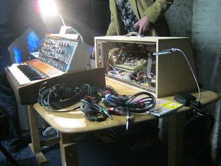 Resonant Blue starts off squatting on the front of the stage, low level drone-stuffs laid out in front of him: keyboard and laptop, it modulates nicely for a while then seems to lift in a rush that precedes a whirr of traffic and field recordings and goes off in a more Ypsilon in Malaysia pale mode, the noise becoming tones and chimes, again it lifts into more digital sounding synths, before thickening up again with more choral drones and heading for deep space. Truly music for Starfelds.