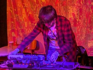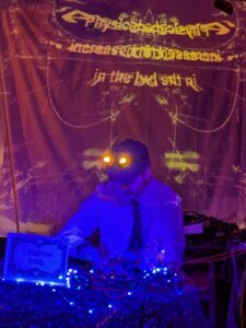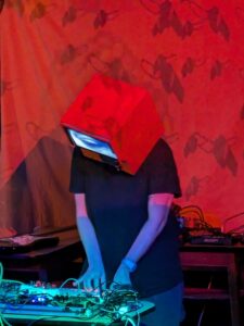 And finally the return of Automouse, on a brief visit from Edinburgh, she sneaks in (if it’s possible to sneak in wearing an orange box with a huge blinking eye on the front) bringing a low level hum sweeping up, and then up again and again to a whistle joined by a one note bass throb, then ticking clock and the drums stomp in. everything is morphing into a more distorted version of itself, the kick you didn’t notice was missing stomps on your head. The whistle sweeps back down and up, then a fully nasty bit of indescribable-ness motors into life and brings a breakdown. We’re back and rolling. Things motor along and that sound comes back – I think it’s a monstrously detuned hi-hat – it’s overwhelming and then it’s off again. A rim shot heralds the start of the next track and we move swiftly into that, a monster bass all sub-sonics and saw-tooths, the bass drum kicks and stops, kicks and stops. We get a breakdown that comes at you from all sides, SF sirens to the left and right, and switch to a faster bass and the single most distorted snare I’ve ever heard. Then a clicking stick pattern ups the energy levels, a cascading beep squirrels away deep inside the mix. Then it’s back into distortion and murk. A slow down into a sliding bassline and a new way of messing up a snare sound into fragments. Everything is starting to feel feverish, sweaty and slippery. The bass drum drops away leaving everything else to pound away then it comes back in doubled up and double time, chopping the bassline. Then a breakdown into stabs and thunder before a nasty metallic cymbal slices through the mix, hiss hiss, then a fatwashing scythe of treble and a slow bump from the kick drum and we’re off into a semi random synth line which heralds a minor breakcore moment. And then the sound empties out apart from the drums. Coming back with more nasty stabs and beeps before dropping to kick on the 8s for a nice length, and back into a rattling breakcore segment. Which goes back into pounding then returns at half speed. Then we’re off into a lengthy breakdown of sub bass pulse and superfast stick clicking before the return of the sliding bass, and a staccato beat, boom, into noise and super distorted boomy kick and a segment of MT40 drum fills (to celebrate 40 years of Sleng Teng, obviously) that get faster and faster and yet faster… A beepy riff and kick drum on the 8s take us off into the next section. Which is more distorted percussion and beeps. The kick is less distorted more like a cranial assault with a 2×4 now, with a white noise blast for a snare. We get syncopation. No bassline. And buzzing synth line threading through several breakdowns. We end on that thunking bass drum and the sliding synth. A fever dream of the last 45 years of electronic music in a tinnitus sufferer’s head.