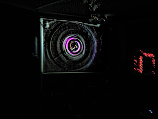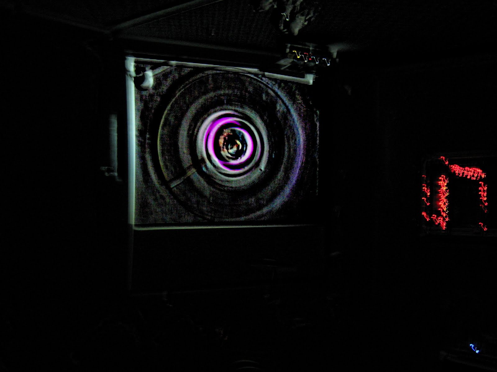 The meaty filling in the sandwich was provided by a nice AV set from Ned Rush. He was running a modular synth, and linked that up to a laptop to create some kind of generative visuals. A lot of the visuals had that kind of kinetic thing going on so you constantly feel like you’re travelling into the screen. In the absence of having videoed his whole set I won’t reference his visuals again. The sounds started with small tonal blips and hums, scatter glitches and tiny squelches. It’s the most freeform thing I’ve seen anyone do on a modular, managing to avoid the tyranny of clocking or LFO. This is followed by something where he gets a hum and white noise loop going, with an acidy squelch with a growl that becomes a bassline. This deepens in intensity and rhythmic intent, like some odd hyper-interlocked rave where someone has stolen the 909. He slews in these odd concrete sounds and nasty drones to keep you off balance, and the breakdown when it comes almost makes you stagger sideways with its glitching detunedness. The final piece really pushes it, like something from a chill-out room of a party where the ketamine has been laced with strychnine and half those present are travelling backwards through time. Great stuff.