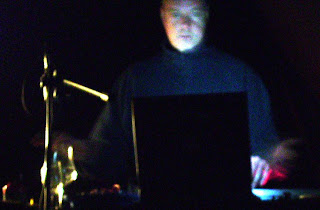 Second up is Andre’s Elbow, Dan Powell and Tony Rimbaud, the soundcheck was excellent, Tony processing Dan’s small percussion and throat singing to lovely effect; a rolling thick exotic mosaic. The set itself is marred with some tonal feedback that seemed to get deep into the effects chain and won’t go away, and as a consequence they were too distracted trying to dispatch the thing to really gel. I’d like to see them do it again, as when they had everything back and under control Dan had some whistling vocal drone and singing bowl going on and it finally started to show the promise of the soundcheck.