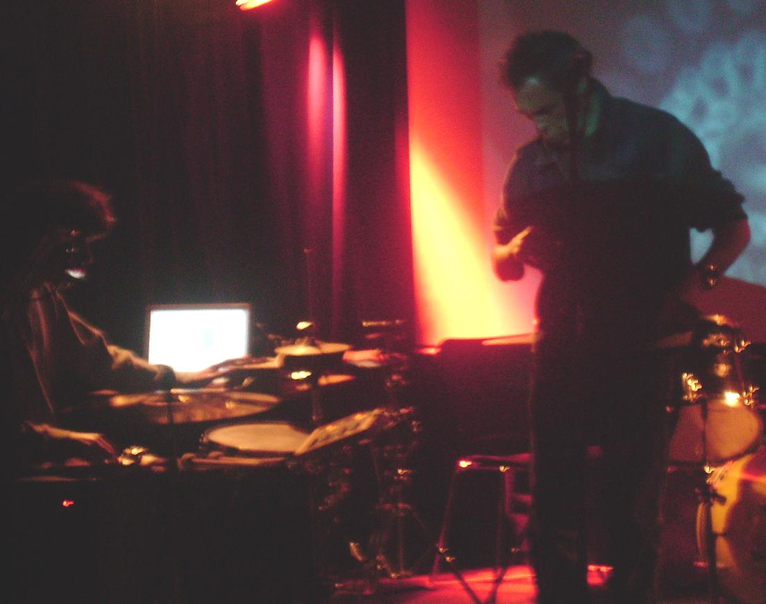 Komuso (Derek and Cliff) are joined on stage by Der Rompf (Robert and Stephen). Starting slow, grit and warble with e-bowed guitar sliding in. A big metal sheet propped up against one of the GDS oil drum tables and electronic drums rattle in a Martin Denny-esque exotic patter, curling the guitar off into arabesques before fading out into noise and space whorls. Cliff has an interesting approach to the electronic drums, scraping around the edge and beating the limits rather than time. It builds again before sliding down to a quiet keyboard figure before some bassy growling gets them in the mood for proper metal bashing beats and space beeps to out.