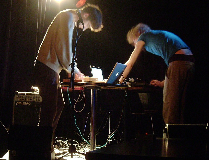 Rounding off the evening with a banging set was Xylitol, eschewing the toys and J-Pop of olden times Catherine was laptopped up. Starting with a whooshing hardcore breath riff with birdsong that morphed into hard chimes and when the drums boomed in went again to pinging arpeggios. The drums hyperactive, everything almost in slow motion against them until a super distorted bassline/bassdrum and whistle melody showed up. Then the full on hardcore breaks. The whistle melody comes over all beautiful to compensate. The drums shift again savagely jungled up. They keep shifting. The breathy riff has gone replaced by an evolving 80s synth descending part. Things shift again, the rhythm carried by a frantic, disturbed frog and snare that turns into buzzing, and again pinging. Shifting again, this one beyond my descriptive powers, again channelling early 90s hardcore, almost lovely detuned synths, fierce drums and a melodic line like a doorbell on the dregs of its battery. Finally a breakdown, into a simple synth line that fills out and wanders away from the tune into pure modulated abstraction. Drums, a bit slower (the ballad?) start up and after a while a massive sine bass slows in in a deranged homage to GLR. Interplanetary hisses, beauty, horrifyingly out of tune synths all merge into something quite wonderful. Then there’s a distinct change to the next tune, harking back perhaps to the bent toys, with a childlike, almost Moog demo line, against which everything else builds in intensity. The last piece starts with a fast high synth riff not unlike chime under which speeding snares and high hats clatter. The synth riff obviously evolves into something else, the drum intensity builds, pads appear, horrible noises emerge and disappear. Half heard piano riffs. Nasty drum bangs, and sudden drops. A pulsing staccato one note bass. Ghostly whoooo noises. My goodness, so much going on, a fever delirium. The first half of the set is a single piece has everything shifting so much the points where songs merge are all but unknowable as it’s just another change in a constantly drifting sea of sound.